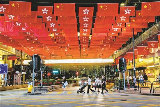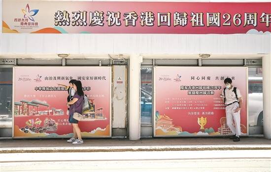 走在港岛、“油尖旺”(油麻地、尖沙咀、旺角的统称)等香港街头,处处可以感受到各界同庆回归的气息。从户外大屏、天桥、学校,到电车和巴士车身,“由治及兴新阶段,‘一国两制’新航程”“同心同庆,共创未来”等庆祝回归26周年的标语跃然眼底;中环码头,国旗、紫荆花区旗迎风招展,“中国红”的旗海在维港的蓝天映衬下,喜庆气氛浓烈。