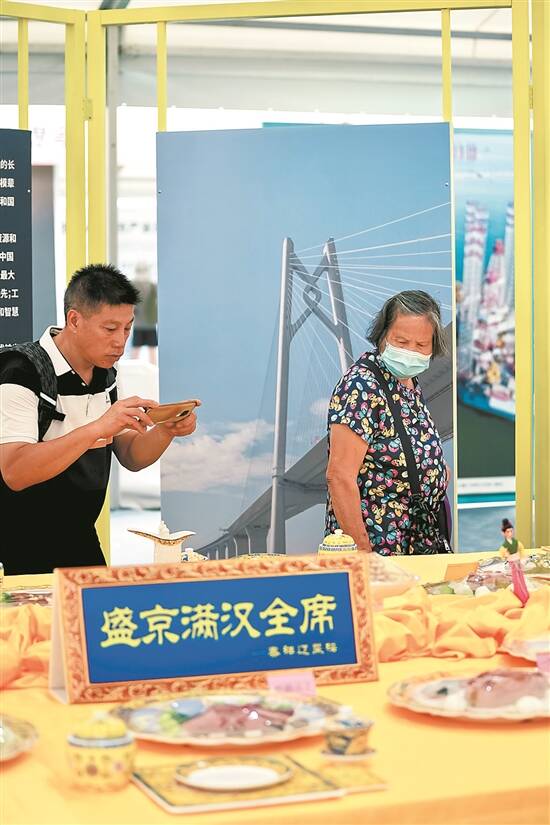 6月30日,香港一个非遗展览,香港市民对着满汉全席拍照