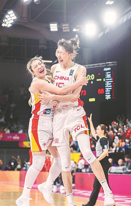 7月2日,在澳大利亚悉尼举行的2023年女篮亚洲杯决赛中,中国队以73比71战胜日本队,夺得冠军,图为中国队球员李梦(左)和韩旭拥抱庆祝 新华社发