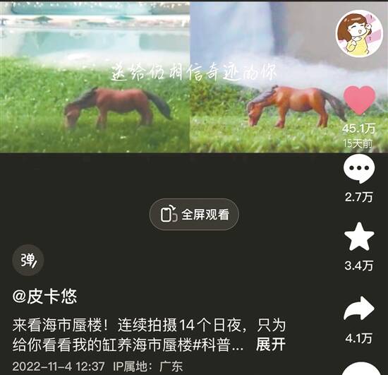 “有些人脑子里总容易生出不切实际的想法,这一次,她竟然想看海市蜃楼。”2022年6月,抖音视频创作者@皮卡悠 决定做一个在鱼缸里复现海市蜃楼的光学实验。5个月后,经过反复失败,@皮卡悠 的实验终于成功了。在抖音上,这条历经14个日夜连续拍摄而成的6分半钟视频,迄今已有超过950万浏览量,超过45万名网友点赞。
