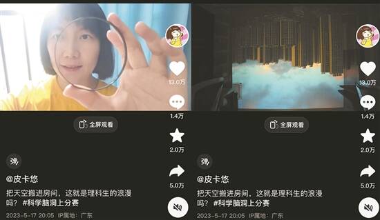 在最新一期视频中,@皮卡悠 利用人们熟悉的小孔成像原理,再以凸透镜加持,让窗外的风景洒满拉上窗帘的房间。她把这期视频的名字定为《把天空搬进房间,这就是理科生的浪漫》。她说,理科在她看来就是最浪漫的,就像物理学家和科普作者劳伦斯·克劳斯的那句名言:“你身体里的每一个原子都来自一颗爆炸了的星星,你左手的原子与右手的原子也许来自不同的星。这是我所知道的物理学中最富诗意的事。”