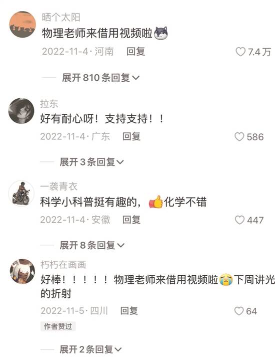 因为做视频,她在抖音上结识了很多志趣相投的朋友,不少学生私信她说找到了学习的新乐趣。曾有一名初中生给她留言:“姐姐,原来这些知识可以那么有趣、那么好玩。”还有一名大学生告诉她,受到她那期海市蜃楼视频的启发,他把光学原理应用到了建筑设计中。