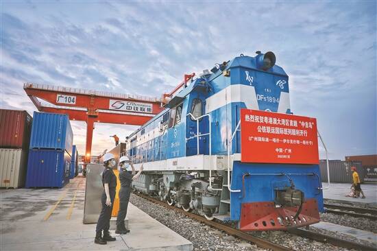 7月4日,随着汽笛鸣响,一列满载着办公家具、空调、小家电等粤港澳大湾区名优特色产品的国际班列,从位于广州市白云区江高镇的广州国际港驶出。这标志着从粤港澳大湾区始发的“中吉乌”公铁联运国际班列正式开通运营,为粤港澳大湾区与中亚之间的商贸往来提供了更方便快捷的通道。