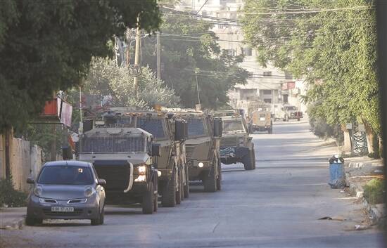 3日,在约旦河西岸北部杰宁地区,以色列军车从难民营附近驶过 新华社发