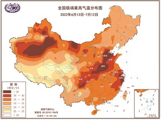 2022年6月13日至7月12日全国极端最高气温分布 图源 国家气候中心