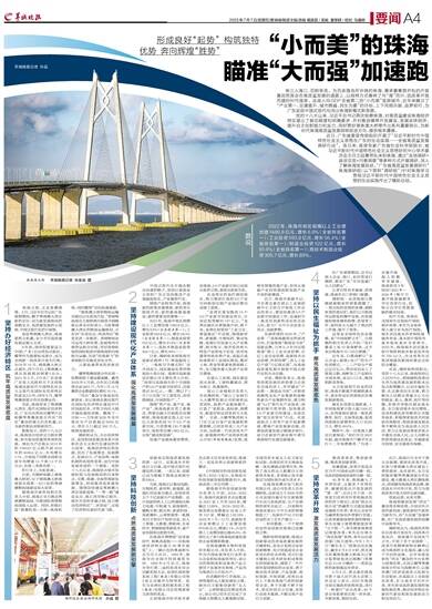 珠江入海口,百舸争流。为百余海岛所环绕的珠海,秉承着兼容并包的开放基因昂首走在高质量发展的道路上,以独特方式奏响了向“海”而兴、因改革开放而盛的时代强音。这座人均GDP全省第二的“小而美”宜居城市,近年来确立了“产业第一、交通提升、城市跨越、民生为要”的目标,上下同频共振,追梦前行,为广东实现中国式现代化闯出珠海新模式新思路。