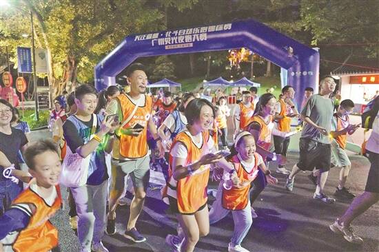 8日晚,广州荧光夜跑大赛在越秀公园举办。来自粤港澳大湾区的亲子家庭、成人组、青年组等4个组别、共500名选手参加比赛。