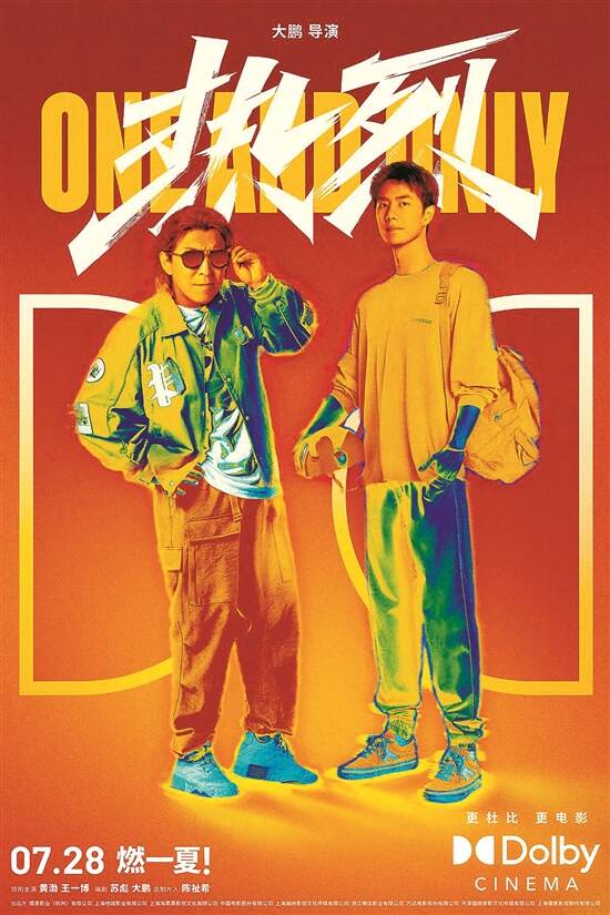 杜比影院的制式海报则展示了电影《热烈》的热血氛围。丁雷左手扶着墨镜,右手叉腰,街舞老炮儿的不羁态度尽显。而追梦少年站在旁边,展现着街舞新生代的青春勃发,这是专属于夏天的“热烈”。