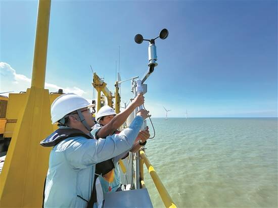 广东省气象局数据中心联合湛江市气象局、徐闻县气象局技术人员,在台风影响前,到徐闻外罗海上风电升压平台安装北斗通讯设备及气象仪器 司徒仕尧 摄