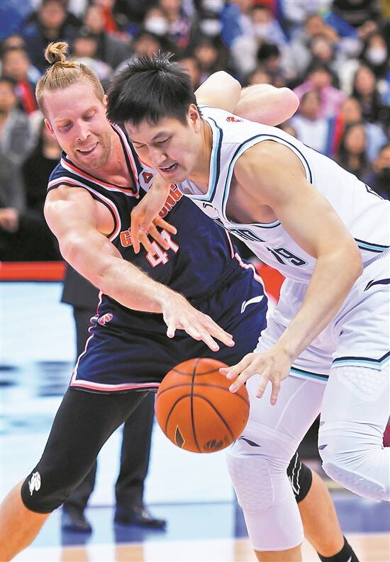 区俊炫(右)在CBA比赛中拼抢 新华社发