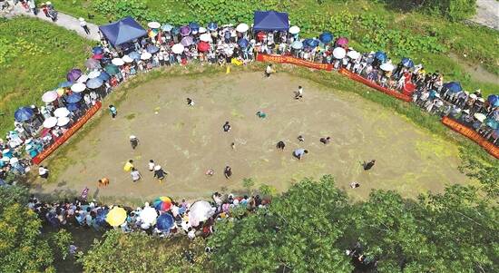 7月初,广西富川瑶族自治县葛坡镇举行第四届摸鱼节,来自各地的游客和当地瑶族群众一起参与极具民族特色的摸鱼活动,乐享夏日清爽。图为葛坡镇深坡村月牙塘中的摸鱼活动,吸引了众多观众。