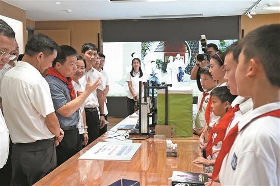 杨利伟一走进校园,映入眼帘的,便是浓重的非遗色彩与现代高科技深度融合的美好校园。穿着“宇航服”的附小学生和少先队员们已经列队,在校道上向杨利伟敬礼问好,并为杨利伟戴上红领巾,热情邀请他在小朋友的宇航服上签名。少先队员迎上来,向杨利伟献上鲜花,一年级小导游牛浩然,为杨叔叔和领导嘉宾介绍附小的教育特色。