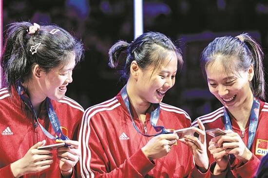 中国队球员在颁奖仪式上端详奖牌 新华社发