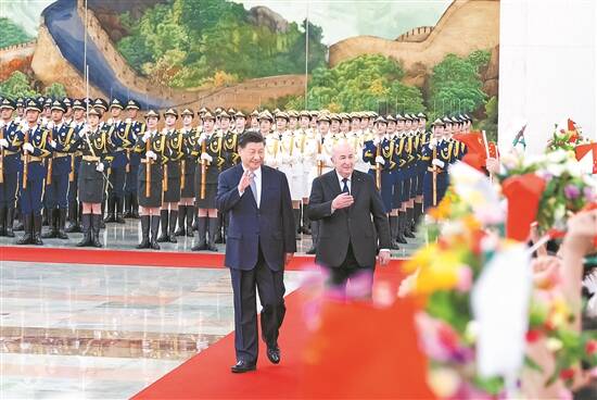 习近平指出,今年是中阿建交65周年。65年前,反对帝国主义和殖民主义、争取民族独立解放的共同事业使我们两国走到一起。65年来,中国和阿尔及利亚始终患难与共、守望相助,相互理解、相互支持,是追求共同发展和民族振兴道路上的真诚朋友、天然伙伴。中方正在以中国式现代化全面推进中华民族伟大复兴,阿方正在着力推进建设“新阿尔及利亚”。中方愿同阿方一道努力,发扬光大传统友谊,推动中阿全面战略伙伴关系取得更大发展。