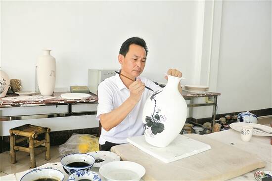 “我是大埔人,家乡盛产陶瓷,家里的长辈也是从事陶瓷生产的,所以我从小就接触和了解陶瓷,也喜欢陶瓷。”丘汉松说。自工作以来,丘汉松扎根山区,潜心钻研,在陶瓷绘画、造型设计上不断深造,他尤其擅长工笔釉下青花。“他的作品线条非常流畅,韵味十足。”广东昌隆陶瓷股份有限公司员工郭梅芬说。