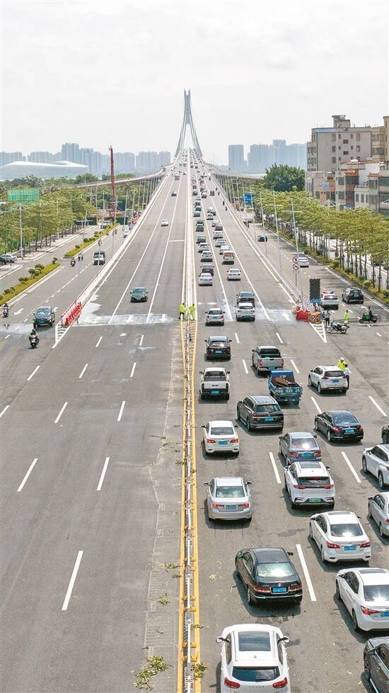18日11时,湛江市三防指挥部将防风Ⅰ级应急响应降为防风Ⅲ级应急响应,海湾大桥、调顺跨海大桥、南三大桥、东海岛大桥、黄坡大桥即时恢复正常通行。记者在乐山路看到,车辆纷纷驶入海湾大桥,一切井然有序。
