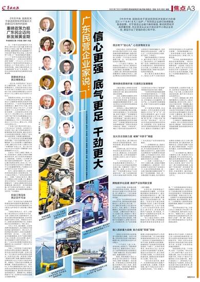《中共中央 国务院关于促进民营经济发展壮大的意见》(以下简称《意见》)出炉,广东民营企业家们倍感振奋、备受鼓舞。对于促进企业做大做优做强、推动民营经济高质量发展,无论是龙头企业大咖还是中小微企业老板,都显示出了更强的信心和干劲。