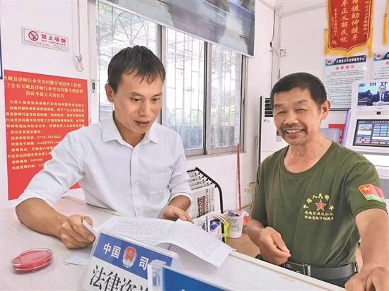 “1+1”中国法律援助志愿者行动开展以来,广东先后向中西部地区派出121名、230人次志愿者律师。图为广东律师郑穗军在志愿服务地为一名退役军人提供法律援助