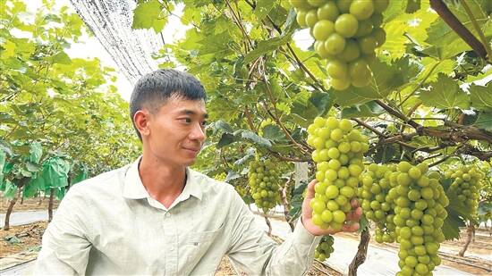 馨果园生态葡萄庄园的种植户周先生是一名“80后”,6年前,他从五金行业转型做种植业,如今在东莞同沙生态公园内租种了约20亩地块夏种葡萄、冬种草莓。周先生的葡萄园主打品种为阳光玫瑰和巨峰,平时来同沙生态园的游客、市民较多,种植园可以说自带流量。“今年的产量还可以,阳光玫瑰每亩产量为1250公斤—1500公斤,巨峰葡萄每亩产量约为750公斤。”周先生说,目前葡萄第一批果已经大熟上市,吸引了不少市民游客采摘。周先生说,接下来,他还将通过加强保花保果、精准施肥、科学用药等技术手段,提高葡萄的香度和甜度。