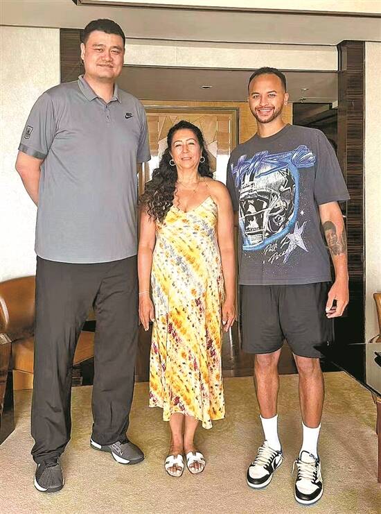 李凯尔(右)及其母亲与姚明(左)合影 中国篮协供图