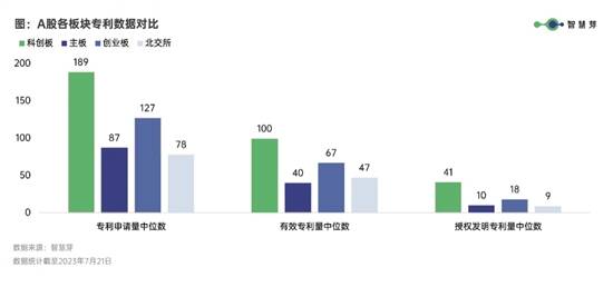 截至7月21日,A股主板上市企业的专利申请总量中位数为87件,有效专利量中位数为40件,授权发明专利量中位数为10件。创业板上市企业的专利申请总量中位数为127件,有效专利量中位数为67件,授权发明专利量中位数为18件。北交所上市企业的专利申请总量中位数为78件,有效专利量中位数为47件,授权发明专利量中位数为9件。对比来看,在上述三项指标中,科创板均显著高于A股其他板块。