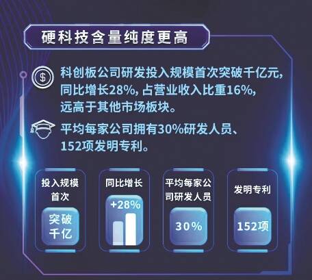 研发投入高,一直是科创板的突出特点。数据显示,2022年,科创板公司研发投入总规模首次突破千亿元,达到1285亿元,同比增长28%,研发投入占营业收入的比例平均为16%,同比提升3个百分点,远高于A股平均水平。其中,生物医药、集成电路等行业研发投入强度居前,不少企业研发投入占营业收入比例超过30%。