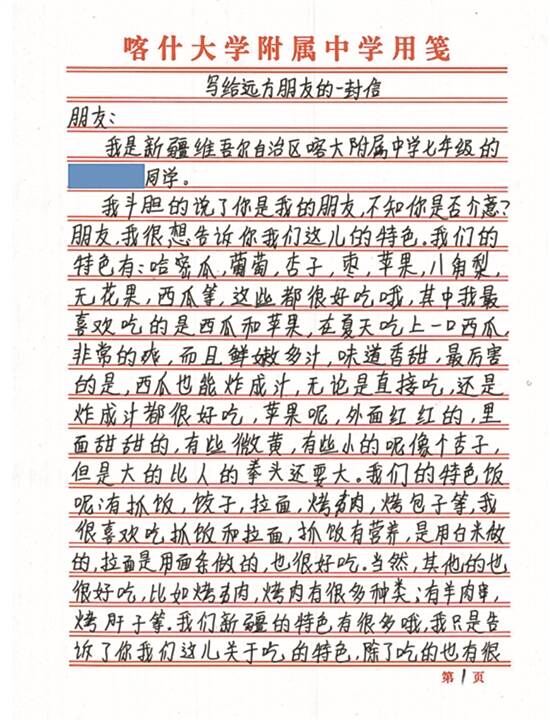 喀大附中的少先队员们在收到广州学生寄来的书信后,也用笔写下了自己的心里话,介绍了新疆奇特的自然景观、特色的人文和新疆美食,还热情邀请华附增城学校少先队员们到喀什做客,领略新疆的民俗风情。“我会等着你们来喀什旅游!有机会我也特别期待去广东见你们!”喀大附中初一学生布麦尔耶姆在回信中写道。