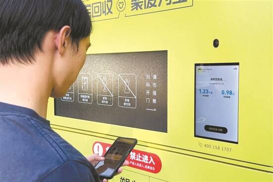 记者掏出手机,对准屏幕上的二维码扫了扫,回收机仓门自动开启。待记者将塑料瓶投递进箱后,屏幕上弹出一行字:本次投递0.23千克,结算金额0.18元。点击“投递结束”按键后,箱门关闭,收益到账。据了解,居民投放的可回收物,统一回收价格为0.8元/公斤,满10元就能提现到微信零钱。