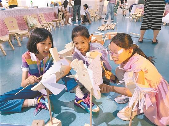 从6月至7月,广州市儿童公园每周都有不同的艺术活动。比如在“孩纸”工作坊,孩子们学习制浆、调制、加工成型等步骤,参与手工造纸全过程;“木鸟”工作坊则带领孩子们学习选木材,教孩子们如何将一整块木头进行切割、抛光和打磨。
