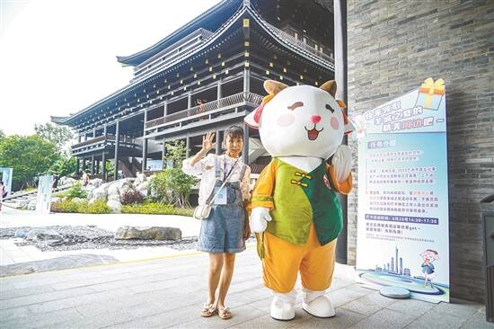 7月19日,游客手捧成都大运会吉祥物“蓉宝”在杜甫草堂的红墙边留影 新华社发