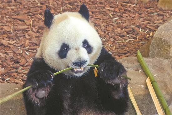 在成都大熊猫繁育研究基地,大熊猫“芝麻”在吃竹子 新华社发