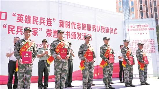 “我承诺:传承港口‘英雄民兵连’红色基因,尽己所能,不计报酬,帮助他人,服务社会……”7月31日,港口“英雄民兵连”营区,民兵们身穿迷彩、精神抖擞,迎接港口“英雄民兵连”新时代志愿服务队队旗。