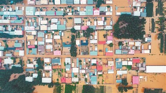 3日上午9时30分,羊城晚报记者跟随江苏盐都蓝天救援队抵达刁窝商业街入口处,急速的水流从商业街路北涌出,路南的玉米田被冲倒了一大片。此时,商业街前的S371省道上不断驶过运送物资的铲车、货车,以及救援队驾驶的皮卡车。