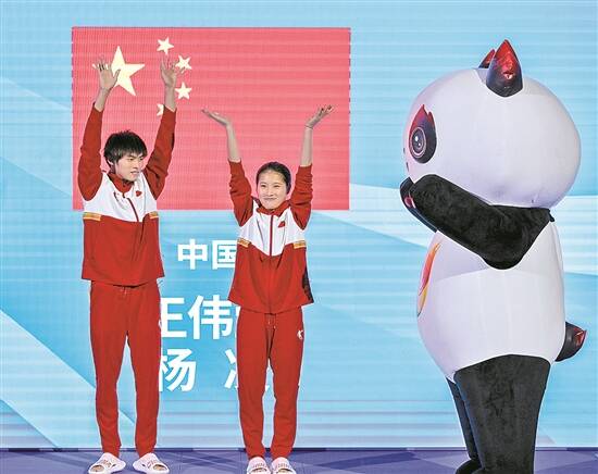 8月3日,成都大运会的跳水项目在简阳文体中心游泳馆继续进行,广东选手王伟莹夺得女子跳台金牌,并与杨凌合作再摘混合双人三米板金牌。