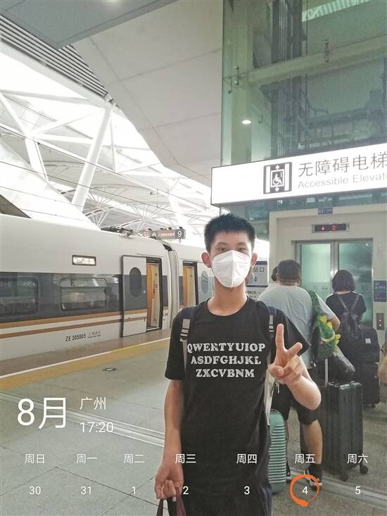 8月4日一早,14岁的孤独症男孩李道宇和他的妈妈方忠琼从北京西站出发,坐上了回广州的高铁。下午5点多,列车抵达广州南站。下车后,李道宇在站台上比了个“耶”,方忠琼用水印相机为他拍下了一张照片。