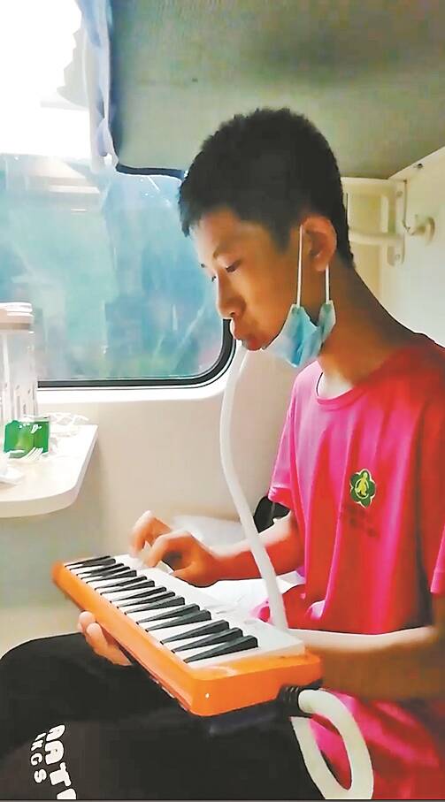 车窗外还下着雨,14岁的孤独症男孩李道宇用口风琴吹了三首曲子,其中就有他近来最爱的《萱草花》。“有乘客鼓励他‘吹得不错’。”他的妈妈方忠琼说。