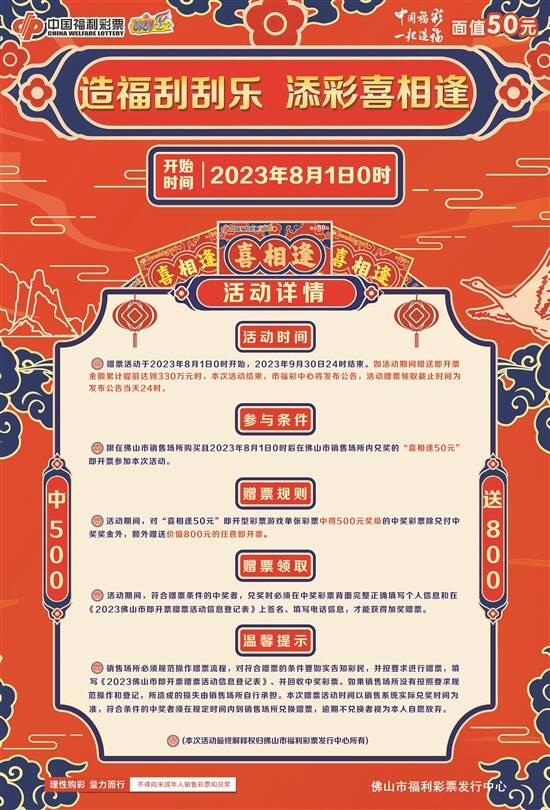 为了回馈广大购彩者对即开型福利彩票的支持,提升福彩品牌影响力,做好即开票宣传推广,激发市场活力,佛山市福彩中心自8月1日起开展“喜相逢50元”即开型福利彩票330万元赠票活动。凡购买“喜相逢50元”即开型彩票,并中得500元奖级的,除可获得中奖奖金外,额外获800元任意即开票赠票。