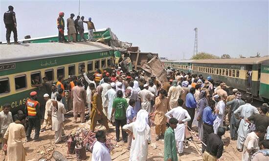 8月6日,人们聚集在巴基斯坦南部信德省桑克尔地区的列车脱轨事故现场 新华社发