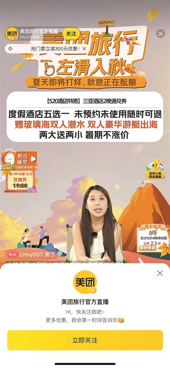 在今年7月12日,有部分网友发现,美团App首页出现了“美团直播”,点击后即会跳转到直播聚合页面。该页面中除了美团官方直播间外,还聚集了“吃住玩”等不同领域的品牌商户。8月7日下午羊城晚报记者进入该页面时候看到,“美团旅行官方直播”直播间观看量已经突破百万;“美团广佛团购官方直播”直播间观看量约5万;此外,MELAND、幸运咖外卖、住玩周边之瑰丽华南等直播间观看量分别从几万到数十万不等。