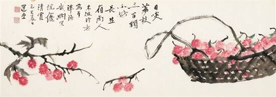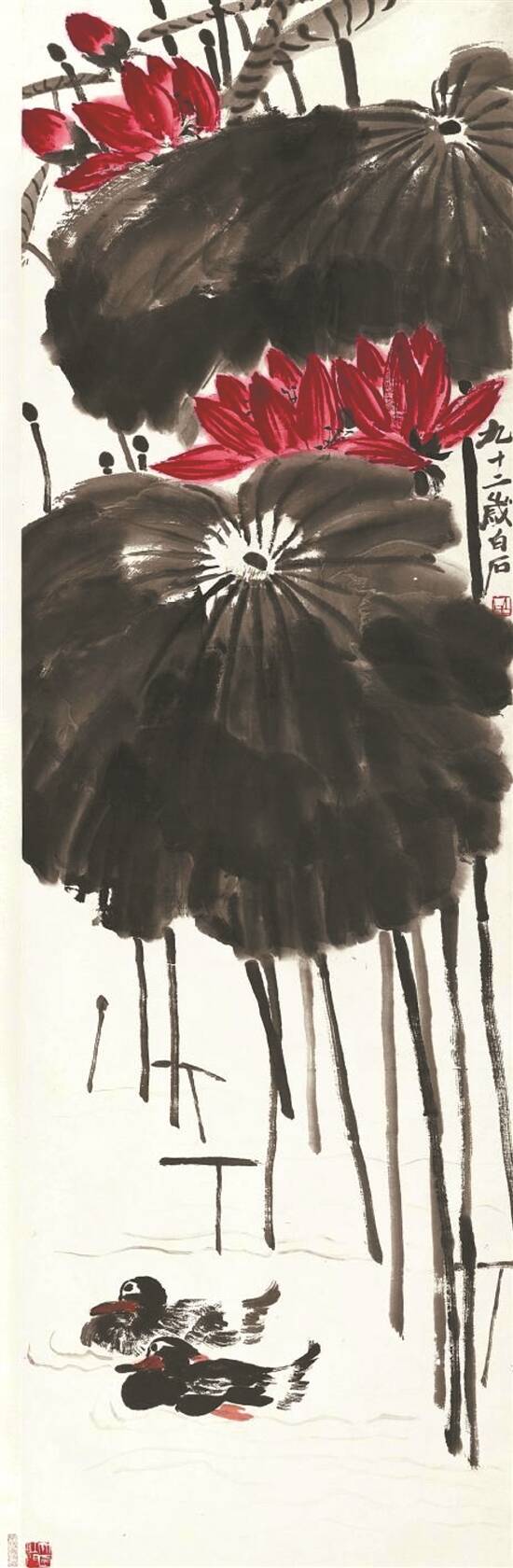 齐白石的《蔬果花鸟》十开册页内容包括红梅、秋海棠、枇杷、玉兰小鸟、紫藤蜜蜂、凤仙蝴蝶、荷花蜻蜓、葫芦、白菜以及葡萄蚂蚱,均是齐白石最为擅长且喜闻乐见的题材。《荷花鸳鸯》是齐白石92岁时创作的作品,也是他晚年较为喜好的重要题材。全作近五尺,也是其晚年绘制的众多类似题材中尺幅最大的一件。该作品仍依循着齐白石“上荷下鸟,上实下虚”的立轴构图,是典型的“红花墨叶派”风格——即荷叶用浓墨渲染、重墨勾提筋脉,加以“红荷”造型进行点缀。
