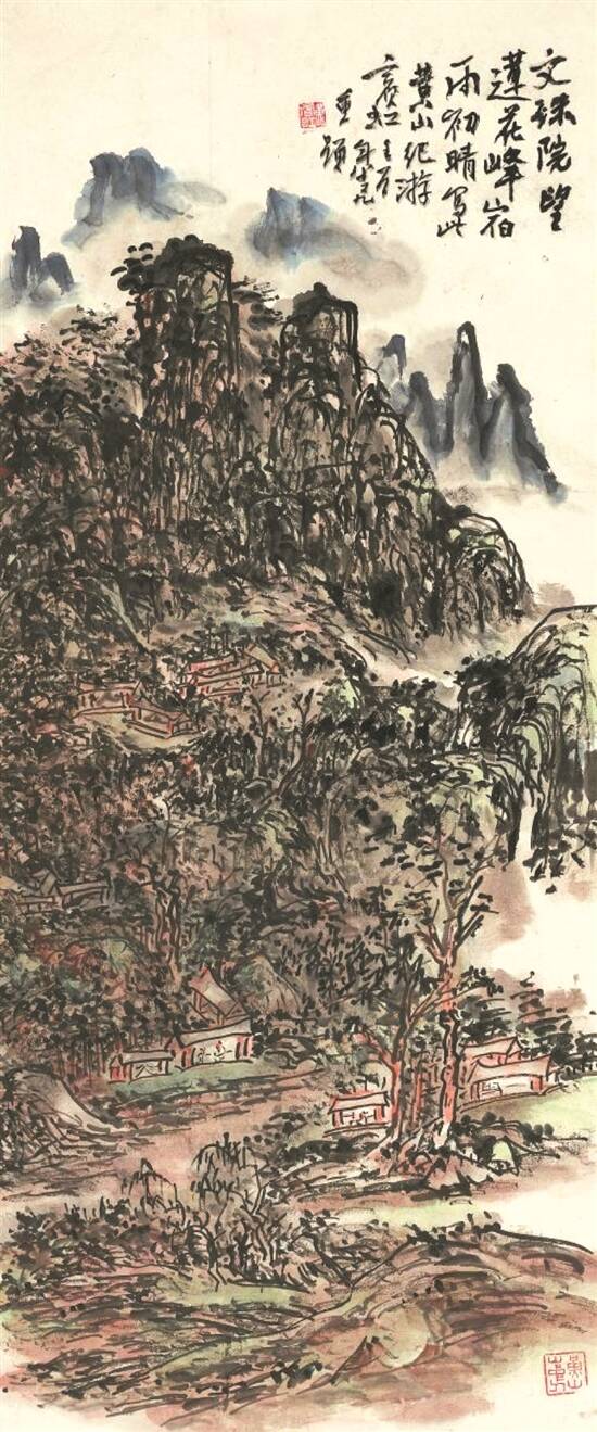 黄宾虹的山水作品大体分为“白宾虹”和“黑宾虹”两个类型。此次展出的《莲花峰初晴》是典型的“黑宾虹”代表作,笔墨苍润厚重,结构堆叠上又不失严谨,用笔有力、精湛;《双峰古刹》则是黄宾虹书画思想进入总结阶段的作品,反映了年届九旬时的黄宾虹胸中对山水丘壑的徜徉体悟。