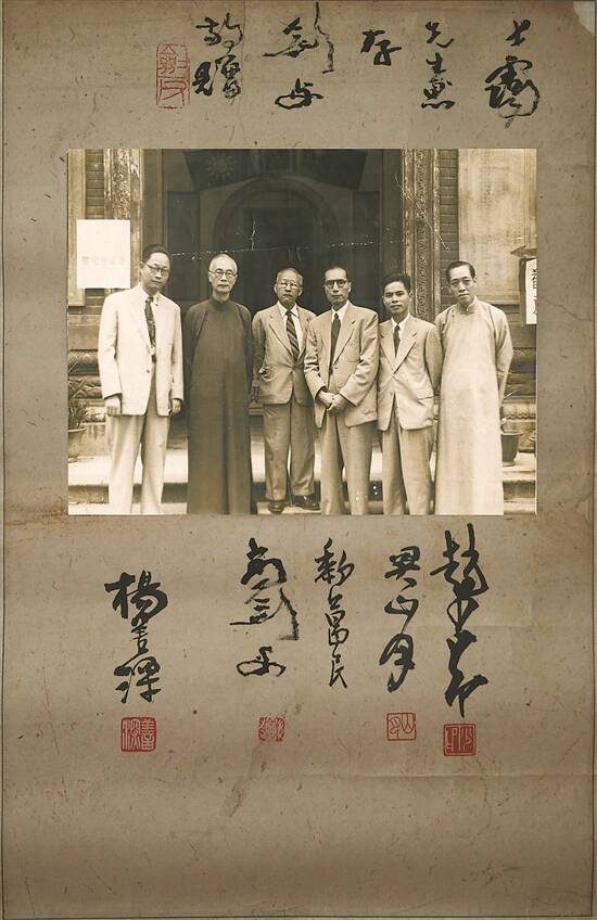 1948年,岭南国画名家六人书画展在广州市文德路的中山图书馆(今广东省立中山图书馆文德分馆)举办,留下杨善深、陈树人、高剑父、黎葛民、关山月、赵少昂(从左至右)六人在图书馆门前的合照,上有签名手迹