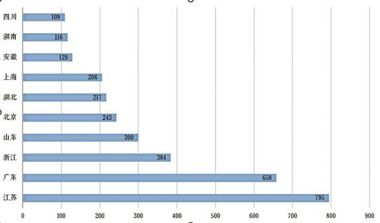 记者梳理发现,按地区分布来看,入围数量排名前十的省份依次为:江苏(795家)、广东(658家)、浙江(384家)、山东(300家)、北京(243家)、湖北(217家)、上海(206家)、安徽(129家)、湖南(116家)、四川(109家)。在5个计划单列市中,深圳以310家的数量位居第一,宁波、青岛、厦门、大连分别为69家、39家、25家、12家。