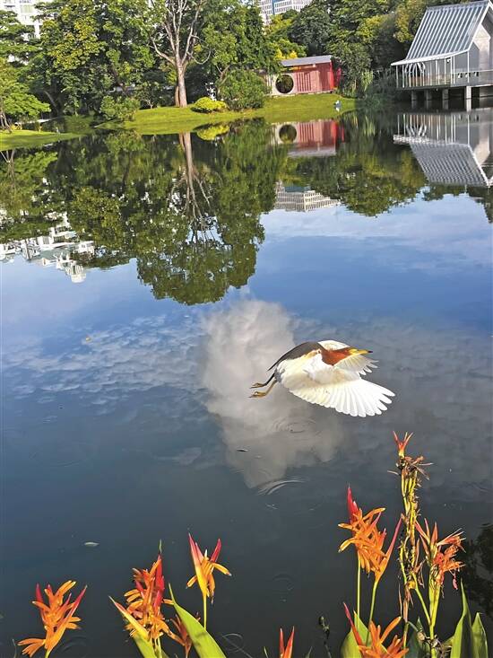 7月底的一天,我在深圳市福田区香蜜公园散步。步行到滨水线湖心附近的时候,眼前美丽的风景让我停下了脚步,忍不住拿起手机拍了好多照片,回家发现,一只水鸟闯进了我的镜头。