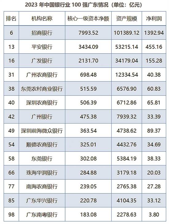 不妨将目光聚焦广东,跻身百强的银行总部“版图”分别覆盖深圳、广州、东莞、佛山、湛江、珠海等地。具体来看,除了“火车头”招商银行,另有平安银行、广发银行两家股份行,位列第13、第16,核心一级资本净额均突破千亿元级别,净利润也超出百亿元。