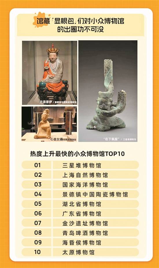 在热度上升最快的小众博物馆榜单中,不久前刚开放新馆的三星堆博物馆荣登榜首,不少年轻人为新馆二刷甚至三刷进馆游览。“无语菩萨”以表情包界的“顶流”身份横空出世,让景德镇中国陶瓷博物馆一举冲入前五。