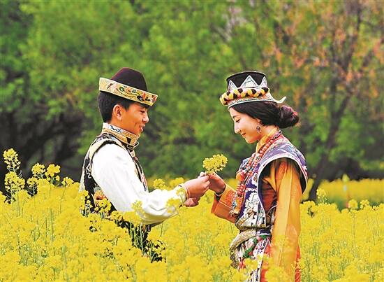 俊男美女在嘎拉桃花村的油菜花田留下美丽的身影 东田 摄
