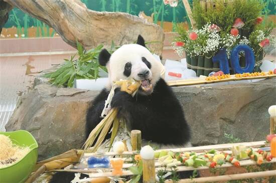 早上8时左右,“奶爸奶妈”已开始为大熊猫布置生日会。豪华生日餐十分吸睛,除了有用水果泥制成的水果冰蛋糕,还有用竹笼装着的窝窝头、竹笋等“一盅两件”点心,而生日蛋糕前的数字“10”十分显眼。