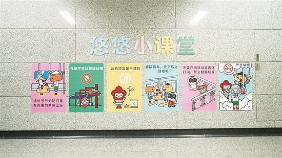 除了传统标识,此次改造特别增加了一系列生动形象的“安全文明出行”小知识,在车站出口通道,设置了色彩缤纷的“悠悠小课堂”栏目,“一米”的张贴高度更方便小朋友阅读,“请勿在车站追逐打闹”“气球不准带入车站”等简短易懂的图例也让小朋友更容易理解。