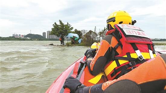 江门 昨天下午,消防人员救援因潮水上涨被困的两名钓鱼群众 通讯员供图